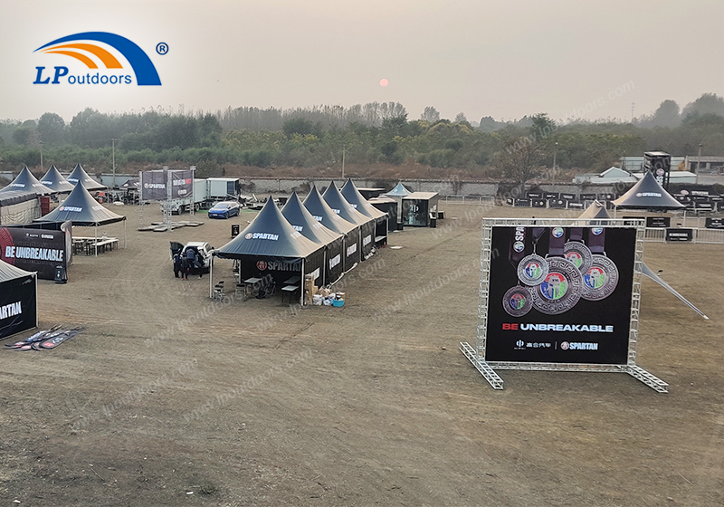 Палатки-пагоды (также известные как палатки с высоким пиком) широко используются на крупномасштабных спортивных мероприятиях благодаря своей отличительной форме, прочной конструкции и превосходному потенциалу брендинга. В рамках проекта «Спартанская гонка» палатки-пагоды играли центральную роль на всей территории мероприятия.
